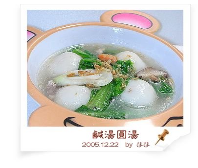 鹹湯圓湯日期:2005/12/22材料鮮肉湯圓(另外用水煮熟才加入湯中)乾香菇蝦米紅蔥頭(或油蔥酥)肉絲鹽味精白胡椒茼蒿菜(另外用水燙好才入湯中)