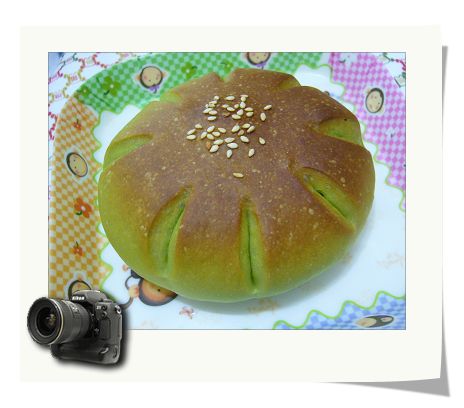 綠綠的麵包皮,輕輕咬下一口,接著暗紅的豆餡跑出來