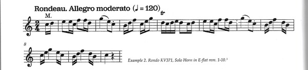 莫札特的第一首協奏曲 (法國號協奏曲,以下都如此稱之),留下兩個未完成的樂章,分別以KV370b 以及 KV371列在曲目中,降E大調,可能寫於1781年三月21日,是為我們所熟知的法國號好友萊特格布 (Joseph Leitgeb 1732-1811)寫的,管弦樂編制為兩部雙簧管、兩部法國號以及弦樂五部,第一樂章的原始手稿有十一頁,留下127小節的筆跡,第二樂章則是幾乎完整原譜的迴旋曲,其中包括了完整的法國號獨奏部分以及部分出現的樂團部分,這個樂章大約於1786年由Jakob Eisen完成,根據作者敘述,於1781年四月8日,由萊特格布與莫札特在薩爾茲堡主教面前演出。