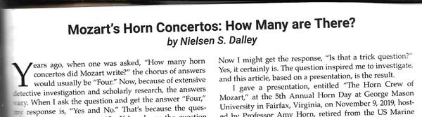 關於【莫札特到底寫了幾首法國號協奏曲?】這個話題,過去在部落格中曾經有文章專門討論這件事,而在2025十月出刊的國際法國號協會會刊 “The Horn Call”中,有一篇文章:”Mozart’s Horn Concertos: How Many are There?” 這個話題再度被提及,這篇文章詳細的探討莫札特所寫過的法國號協奏曲,作者Nielsen S. Dalley,是一名退休的建築師,也是法國號的熱愛者,號稱從七歲開始吹號,到現在吹了超過七十五年,還改編了很多跟法國號相關的曲子,製作了相關的樂譜目錄,在2019年就曾經在維吉尼亞的喬治馬森大學George Mason University的第五屆法國號日 (5TH Annual Horn Day)中做過莫札特與法國號的相關演講。Dalley先生在這篇文章中對於莫札特的法國號協奏曲每首曲子的樂譜來源以及去向做了深入的介紹,所以在此分享這篇文章,當作這個議題的補充。