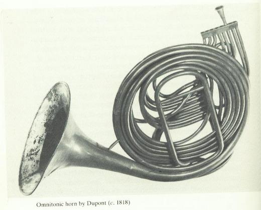 而更直接與法國號的發展有關係的,是「泛調號」的產生。Omnitonic horn這個詞不是很好翻譯出來,現在姑且譯成 「泛調號」。它所指的就是一把樂器,上面裝上了所有常用的調管(crooks),用一根伸縮管(slide)來換音。