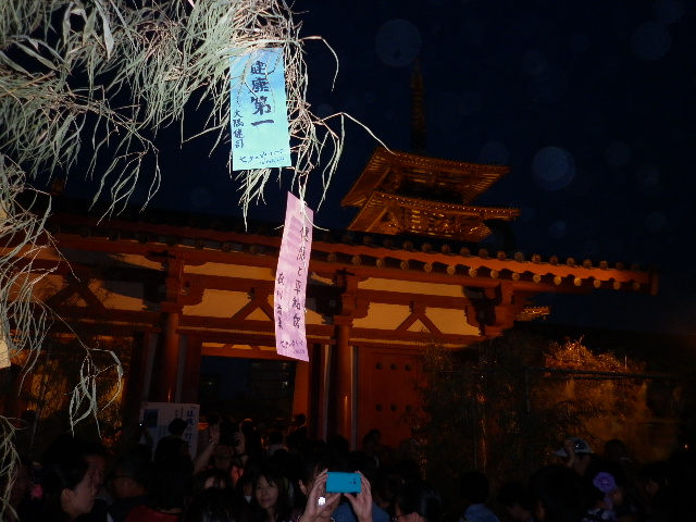 七夕時的四天王寺和平常有多不一樣,從跨進山門口的石大鳥居時就可以感受的到。平時清幽肅穆的寺地裡搭起了懸掛彩帶彩球等充滿節慶氣息的鐵架,廣袤的寺域裡,空氣中飄散著的不是平日所熟悉的線香,而是從小吃攤位裡所傳出的食物香氣,富士宮炒麵、大阪章魚燒、廣島燒…,日本各地的傳統美食共聚一堂,令人目不暇給口水直流。唯獨習慣了漢傳佛寺裡不准葷酒進山門的觀光客,可能會被眼前這樣的光景給驚嚇地瞠目結舌吧。