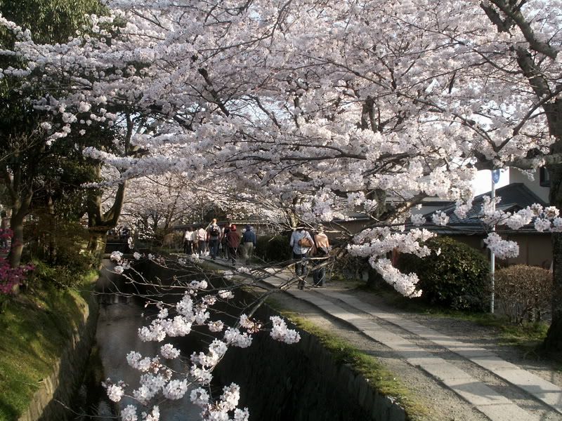 問過幾個導遊跟背包客. 大家都異口同聲的說哲學之道的櫻花最棒!從京都車站上車 公車就已爆滿(太多人排隊等車了) ..又逢假日 路上嚴重塞車!原本30-40分鐘的車程 開了1小時還沒到 日本的公車司機 超守規矩 明明客滿了 還是站站停!加上今天好熱 真是快掛了! 途中 已有幾個洋人受不了擠車之苦 . 提早下車去了! 呵呵 再有一次 絕對不要假日來京都! 咦! 明明還有兩站 為何大部分的日本人 都下車! 好吧 反正我也快受不了了 跟著人家下車吧!跟著人家過馬路. 跟著人家走小巷…. 忽然眼前一亮!哈哈!這一定是傳說中的哲學之道!