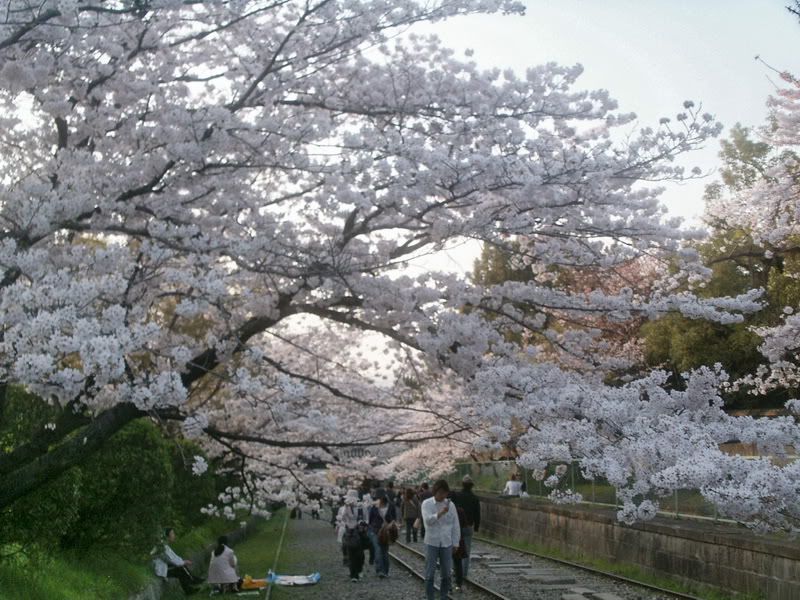 好了 離開南禪寺 總該去搭車了吧!順著大路走出去. 糟糕 !好像沒有公車站!東晃西逛就是沒找到公車站 但是看到了湖!湖邊當然有幾顆櫻花 順著櫻花看過去. 喔喔! 發現了一條舊鐵道! 而且是 滿滿都是人的鐵道!加上兩旁令人目眩神迷的櫻花!!!此時 有沒有找到公車 已經不重要了……!