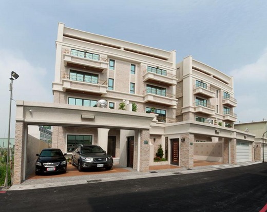 德尚「寬御」,外觀以象牙白色系的抿石及鏽石妝點,建築線條簡潔,房子上端採弧型設計,在天然雨水沖刷下,壁面不殘留灰塵,即使多年後,房子還是常保如新。