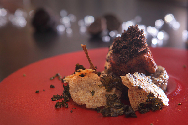 雖然大部分的人,認為這僅是傳奇故事,卻給了Jimmy主廚創作靈感,將黑松露與老母雞一同熬煮,經過長時間後,讓松露香味完全融入湯頭,製作成濃郁又清爽的雞肉清湯。延續著清湯風味的湯料,則以雞肉搭配蘑菇脆餅、蘑菇泥,以及蘑菇製成的酥粉,模擬成黑松露從土壤中生成、出土的模樣;加上用蛋白餅製作出的蘑菇,以液態氮降溫後,製造雲霧飄渺、煙雲瀰漫的夢幻感;更以馬鈴薯裹上竹炭,作成一顆幾乎能以假亂真的黑松露,一上桌就能創造餐桌上的趣味、引人入勝,最後配上現刨的黑松露片,讓雞肉層次風味更加凸顯,也將法國皇帝拿破崙傳說中的黑松露與母雞料理做了最佳詮釋。