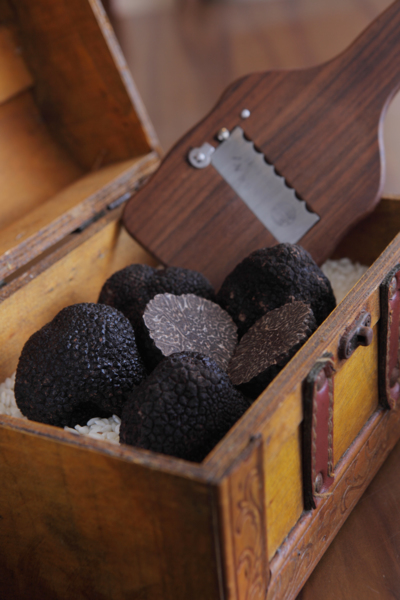 而這些關於黑松露的傳奇,大部分都發源自法國的佩里哥(perigord),因為19世紀時,佩里哥是黑松露最主要的產區,佩里哥黑松露(perigord truffle)也是目前全世界品質最好的黑松露。三二行館歷年來,也堅持只選用法國佩里哥黑松露,因為它的香味最濃郁、細緻,美味指數最高,沒有其他黑松露可以和它競爭。挑選出的佩里哥成熟黑松露,色澤深黑,切開卻有大理石一般細膩優美的花紋,香氣非常濃郁,常帶有麝香、濕地、蕈菇、濕稻草等氣味,不過黑松露獨特的氣味很難形容,只聞過一次就會終生難忘。口感也很特別,好的松露生食會有一種難以比擬的脆爽口感,而且帶有些許甜味,因為生長條件苛刻,所以每年全世界產量非常稀少,但饕客們仍願意付高價購買佩里哥黑松露,讓佩里哥成為最美味松露的代名詞,價格自然相當昂貴,堪比黃金,所以才被稱為餐桌上的「黑色鑽石」。
