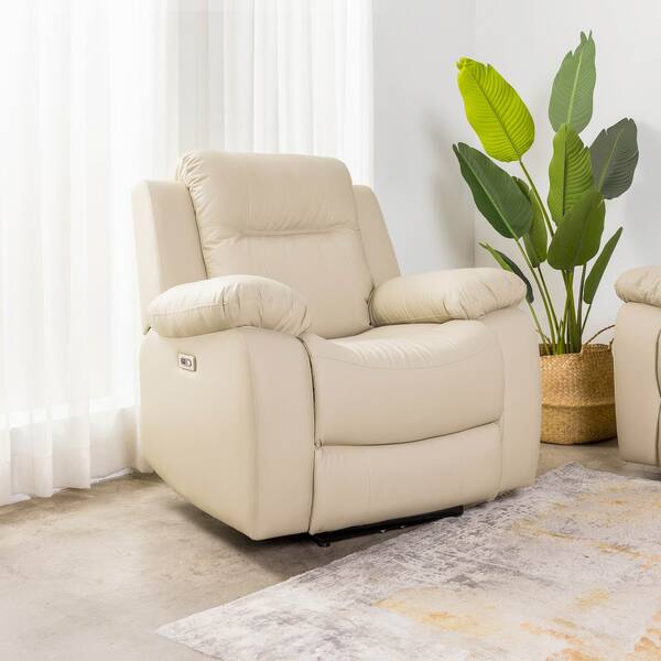 奶杏色貓抓皮電動沙發:坐、臥、躺無段式調整,採用耐磨貓抓皮,耐用好清潔;內建充電孔,邊休息邊充電超便利 。