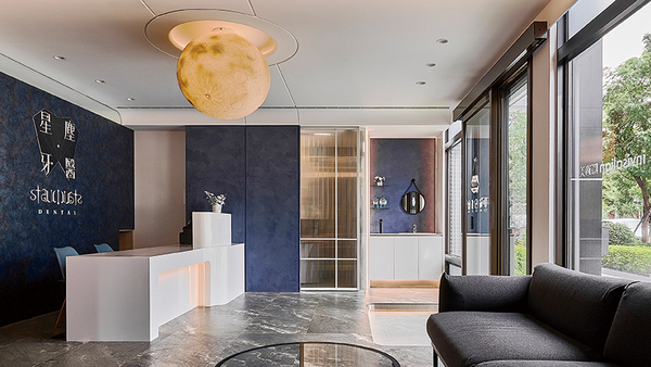 候診區主燈選擇了星球圓燈,牆面的層板則展示了醫師收藏的星座裝飾、繪畫作品,甚至在診間,也設置了懸浮星球燈與德國空氣淨化系統,交織成一場低調又靜謐的詩意演出,每一抹藍、每一束光,都演繹著「星塵」的理念:而每一個呼吸,都能享受潔淨無異味的空氣,專業也可以溫暖,科技與藝術始終並行不悖。讓星塵牙醫不僅是醫療場所,更是一個可以靜謐從容、適合安心微笑的湛藍宇宙。