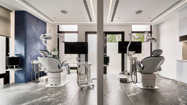 地坪採用合金高架地板,在統一高度的同時,更隱藏牙醫設備所需的繁複管線,讓表面乾淨俐落、專業簡潔,功能與美感相得益彰。入門處右側則規劃為諮詢與衛教區,以長虹玻璃門片作為輕盈的分隔;左側則為X 光室與診療空間,動線的規劃簡潔俐落,對工作人員或者患者都相當輕鬆、便利與流暢。這樣的安排,在有限的坪數中爭取到最具秩序感也最開闊的視覺感,兼顧機能與氛圍,打造能舒適候診、安心就診的醫療環境。