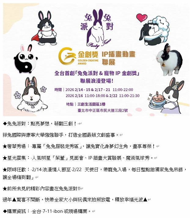 由菲兔國際與康寧大學強強聯手,最萌文創盛事:《兔兔派對 & 寵物 IP 金創獎》活動,將自2月14 日浪漫情人節開展,持續到2月22天使日,農曆春節連假9天,在臺北市中正區市民大道三段2號《三創生活園區》1F室內廣場盛大舉行。