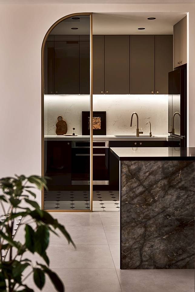 沙發背牆選用質地細膩的大理石紋大板磚,自然流動的紋理搭配垂直向度的線條分割,以及簡單卻不失優雅的線板裝飾,與天花板的柔和弧線形成幾何上的和諧共鳴,透過間接光的暈染,混搭恢弘大氣的落落大方。餐廚區則進一步延續了這種對話語彙,金屬質感的圓柱桌腳支撐起溫潤木質餐桌,連結中島,冷洌金屬與溫潤木色互補出舒適的用餐氛圍。透過異材質的轉換,利用地坪在無形中劃分出場域機能,而在立面的細部,不時點綴的鍍鈦金屬與精準線條,猶如樂章中的視覺韻律,在隱約間透出低調的奢華伏筆,讓每一次的度假時光都成為至高的享受。