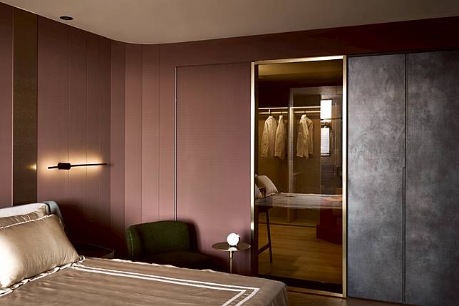 而特別擴張容量的走入式更衣室,亦是回應度假與工作並行型態的重要配置,為滿足屋主對度假生活高品質的追求,更衣室不僅具備強大的收納量,內部設計更延續了空間整體的奢華底蘊,精緻的層板燈帶、低調中透露貴氣的金屬配件,讓衣物的存放本身就如同精品店般的展示空間,不論是更衣或者梳妝打扮,都能轉化為儀式感十足的感官體驗。