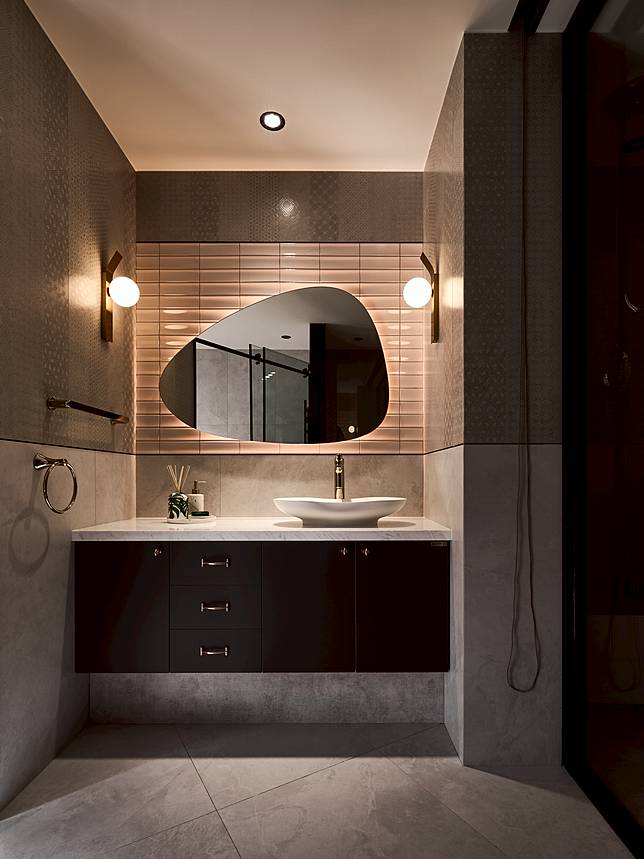 延續公領域的灰階、金屬細節、弧線語彙與優雅氛圍,在比例與觸感上更趨柔和,更增添了溫柔的暖色調,以柔和的光影投射與異材質立面營造出靜謐的舒眠氛圍,使空間在理性之中更保有從容不迫的溫度。寬敞的洗浴空間,與臥室僅以透明玻璃相隔,延續視覺放大空間感,更營造精品酒店般的精緻氛圍,不論何時入住,都能徹底釋放平日在都市叢林裡的壓力。
