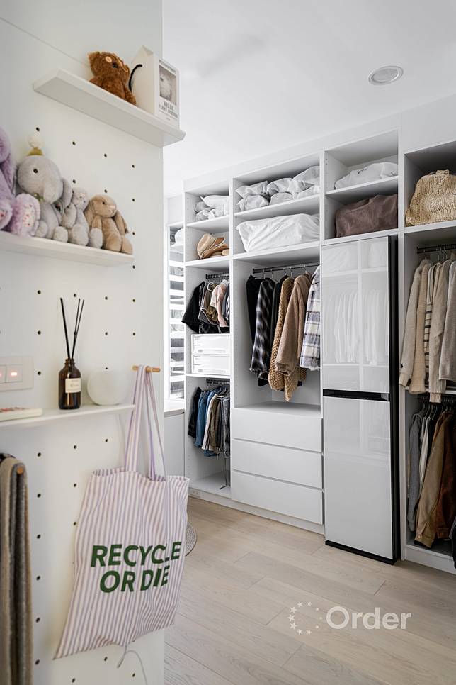更衣室是陳敬宣褪下疲憊、回歸自我的舒心轉場。依據衣物類別,規劃層次分明的開放式收納並整合電子衣櫥,免去換季困擾。櫃體側邊設置洞洞板陳列香氛與包款,並將採光最佳的窗前位置留給梳妝區,陳敬宣開心分享:「不管是工作拍照還是錄製美妝分享,都能展現最自在、最棒的樣子,這裡就是我最愛的充電小天地。」