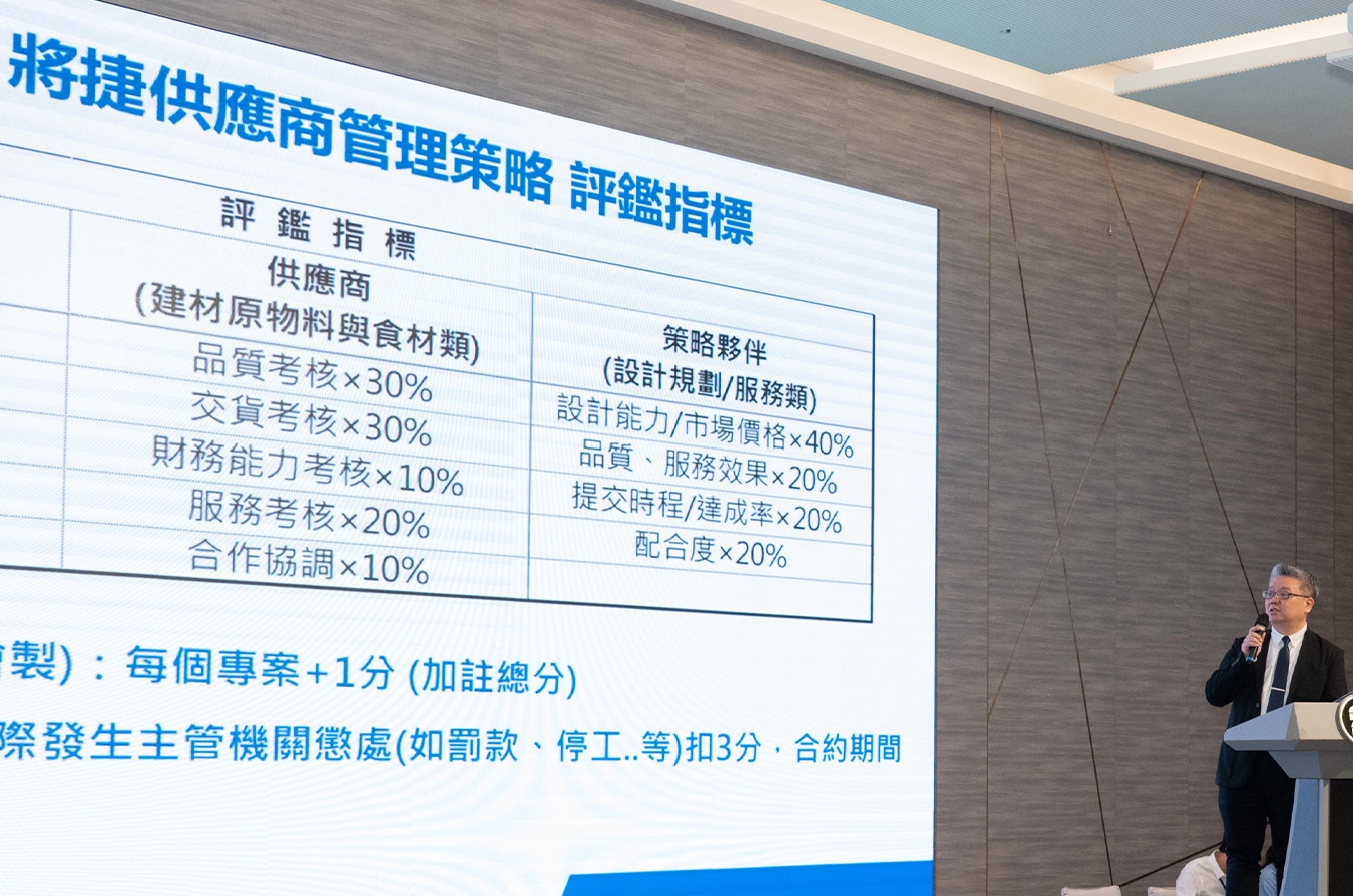 將捷指出,面對資本市場對公司治理與 ESG 管理要求日益提升,供應鏈不只是採購與發包體系的一環,更是支撐企業品質、履約能力與永續韌性的關鍵。因此,將捷持續升級供應商管理制度,逐步將環境保護、勞動人權、職業安全與誠信經營等面向納入管理,期望共同建立更穩健、透明且具競爭力的永續供應鏈。