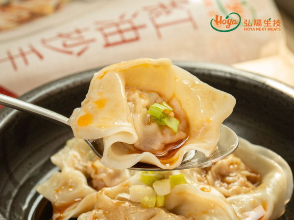 在當前市場中,台灣植物肉原料大多依賴進口,導致生產植物肉過程中近80%的碳排放來自原物料的運輸。為了降低這些影響,弘陽致力於提高國產黃豆的生產量,力求實現國產取代進口的目標,並達到碳中和,為土地和環境創造雙贏局面。我們每一顆抄手都擁有鮮嫩的外皮,裡面包裹著飽滿的植物肉餡,口感鮮美多汁,並搭配獨家秘製的麻中帶辣紅油醬,風味絕佳。弘陽的植物肉為全素配方、無萊劑且無生長激素,不僅讓台灣人安心享受營養滿分的蔬食料理,還能為減少碳排放貢獻一份心力。