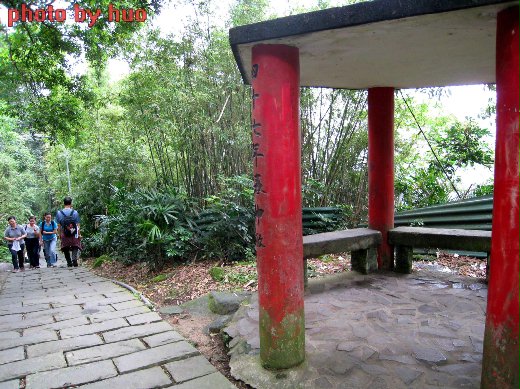 步道經過禪寺的上方,有一座民國47年捐建的涼亭,簡單的涼亭還保有幾許簡樸古風(圖一),涼亭的對面就是福德祠,祠內鄉親滿座,悠閒地喝茶聊天,福德祠旁一棵歪倒的榕樹,為了支撐樹幹的平衡,好像長了五隻腳的動物。