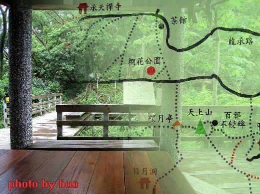 「望月亭」是民國63年退伍軍人封志椿整地修建,取名來自於蘇軾水調頭的詩情畫意:「人有悲歡離合,月有陰晴圓缺,此事古難全……。」望月亭位於往善息寺、日月洞、甘露寺、承天禪寺的中心點(圖三)。