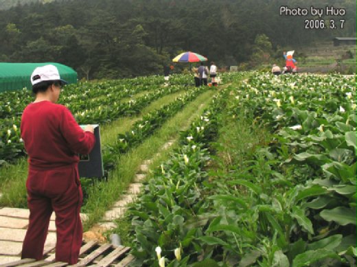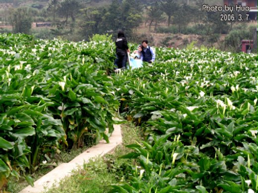 今年的海芋季還未到來,竹子湖受到陽明山花季的「牽連」,即使是非假日也已經是人滿為患,水尾(下湖)的海芋大道車子走走停停,不管是搭公車或開車都有點困難,兩旁的「野菜店」更是忙到不行。海芋田裡有自己摘花的、有用攝影機拍花和女友的、也有站在海芋裡寫生的、連拍婚紗的也趕場,拍完了海芋田,新郎逢人就問:黑森林在那裡?(附圖)。