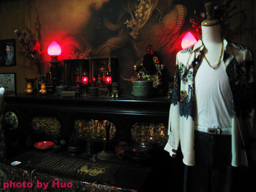 空間不大的房間,卻擠滿了「艋舺」電影粉絲與好奇的人,右邊牆上掛著「造福鄉里」的扁額,左邊是一座舊時的酒吧台,正前方樑上高掛「忠義」二字。牆壁上展出拍攝電影的刀械道具,在佛桌旁陳列的戲服(圖1.2),以及拍戲時的劇照。