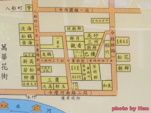 道光、咸豐年間,淡水河碼頭成為船夫與碼頭工人的落腳處,於是和其它海港城市一樣,娼寮、酒樓便一間接著一間地開張起來,豔名甚至遠播至大陸,慕名而來的人數也不少。日據時期,日本妓女來此營生,當局規劃「遊廓」加以管理,範圍大約包括現今環河南路以東、西園路以西、貴陽街以南和桂林路以北(圖4)。