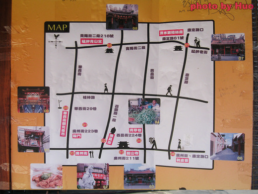 張貼於萬華剝皮寮的萬華半日遊的路線,大致是由隘門>佛具街>龍山寺>青草巷>廣州街>剝皮寮>祖師廟>青山宮>華西街,逆時鐘方向繞一圈,最後回到原點(圖1)。