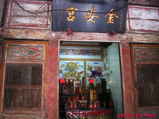 離開古山園,往北方向的巷子走,繞過古式磚石修建的屋子,走到前面才發現是一座小寺廟,容身在巷內的「金安宮」上方紅磚下面石塊修建,仍舊保留5、60年代寺廟的式樣風格(圖3),金安宮旁有好幾家老式「茶店」仍在營業,導覽老師說:「萬華地區的茶店大致可分為四種........。」