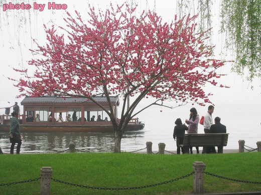 「斷橋」的另外一頭,紅白相間的桃花開得正是時候,朶朶盛開的花,迎著春風綻放;絡繹不絕的遊客,紛紛拿出相機,拍攝著花朶,或者以它作背景,在花前留影。堤道兩旁有紅、粉、白色的桃花,堤道中間有綠色的楊柳,湖面上有船舟,遠處有山影,形成美麗的畫面(圖1)。