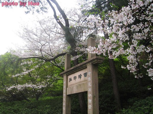 繞過孤山,湖邊步道的桃花,雖然沒有白堤般的姿色,然而,湖中的白鵝、鴛鴦戲水,卻另有一番情趣。「西冷印社」山門前幾棵老櫻花,正逢盛開,與蒼翠的山色,形成了強烈的對比(圖3),那又是另外一番景象……。