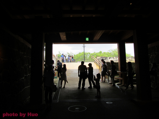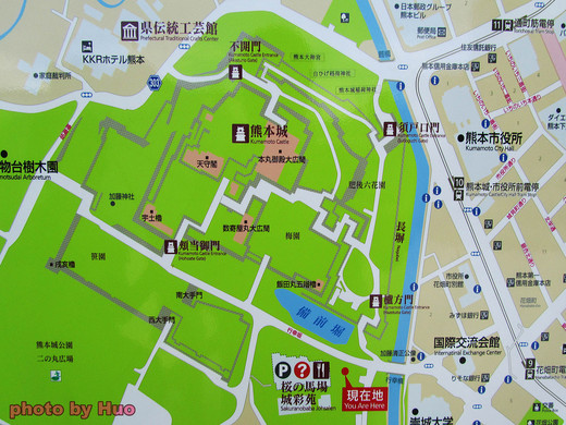 熊本古城入口處是坪井川與護城河交接位置,進入櫓方門後,在「竹之內」廣場,就可以看到巍巍的主建築大天守閣,廣場內有肥後六花園。我們沿著紅線,繞道較遠,緩步而上,可以望見高聳的櫓 (圖2),以及昔日作為防守用途的群櫓,漫步迴轉而上,進入天守閣廣場的是「暗禦門」,「暗禦門」是「本丸禦殿」的地下道,出了地道,就是廣場(圖3) 。