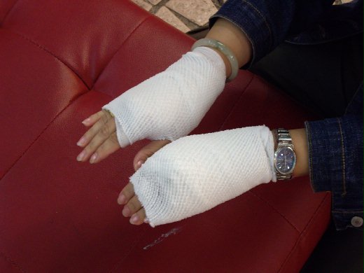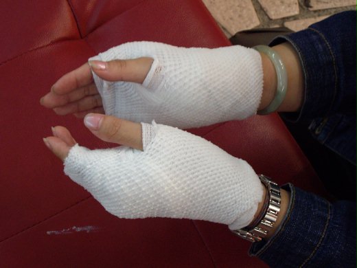 想不到他還拿出繃帶來狂纏,我的玉手就成了料想中的麵龜,