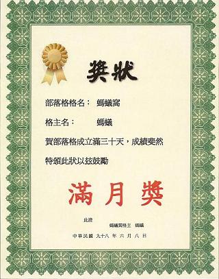 一般的頒獎典禮,領獎人都要感謝一大堆人,今天在這螞蟻窩滿月的日子,我頒張獎狀給我自己;我也要感謝帶我一睹這宗廟之美的石泉,謝謝她的鼓勵、謝謝她為我衝人氣。