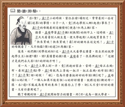 考試內容是遊子吟和閱讀測驗孟子的故事。考試方式是填充題,學生只要從詞庫中選出正確答案放到格子中就可以了。聽起來的確很簡單,只是對這ABC來說,最辛苦的是他的老媽。