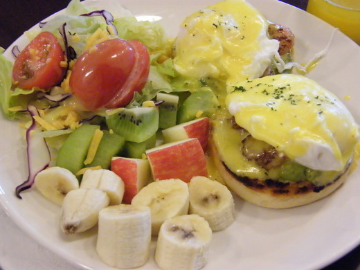 喜愛新鮮蔬果的老饕可選擇店裡的班尼狄克蛋套餐,大量的新鮮水果和綜合沙拉,蛋黃味濃郁,蛋白濃稠,烹調至九分熟,健康又美味。