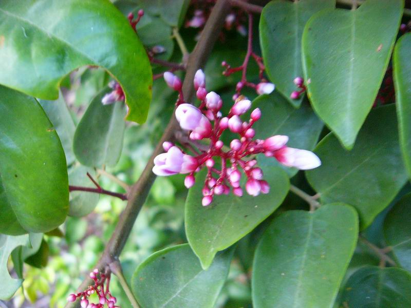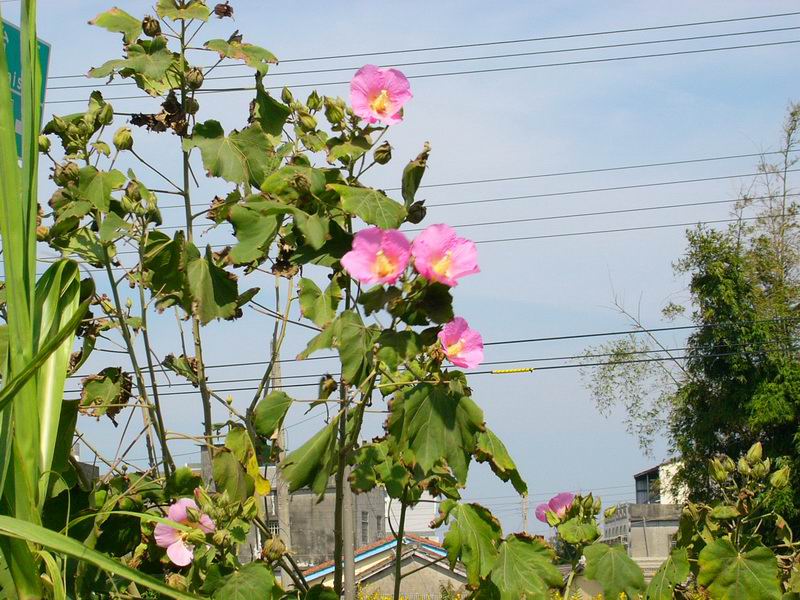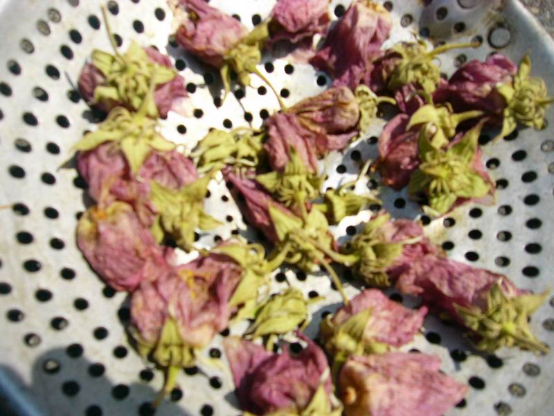 芙蓉花盛開著,媽媽將花朵採下來,在豔陽下曝曬,曬乾後收藏起來,媽媽說花也可以當藥材。