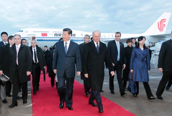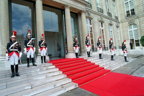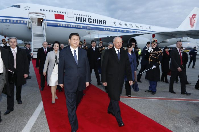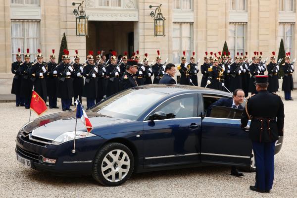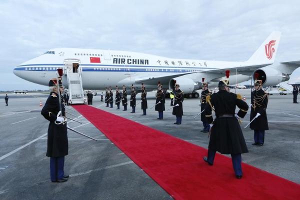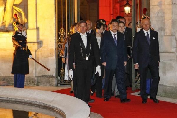 法國軍方樂隊高奏中法兩國國歌,習近平在奧朗德陪同下檢閱了由法國軍隊最優秀、最具特色的軍種組成的儀仗隊。隨後兩國元首乘車前往法國總統府愛麗舍宮,前面有三十四人組成的共和國衛隊騎兵樂團開道,另有一百零四名威武的共和國衛隊騎兵隨後,中間還有二十八名摩托憲兵四周護衛,龐大的隊列浩浩蕩蕩穿越亞曆山大三世大橋,在軍樂聲中抵達愛麗舍宮。據法國總統府禮兵禮儀負責人向法廣透露,這樣的安排可謂登峰造極,法方已經無以複加。有的法國媒體稱這種規格前所未有。