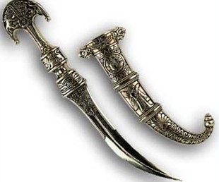 阿拉伯彎刀,也就是“著名的圓月彎刀”,是一種曲線形的刀,刀身狹窄,彎度較大,長1米至1.2米,刀身上有一道較深的凹痕。其特點是韌性和硬度好,刀刃極為鋒利,據說可以將一片薄紗半空掠為兩半,並且能將一個鋼鐵的頭盔猛劈為兩半。