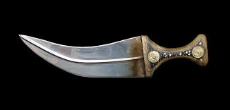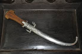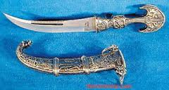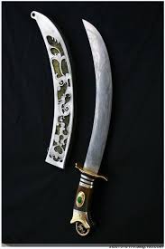 伊斯蘭教先知穆罕默德在對抗多神教麥加貴族的爭戰前,賜予了其女婿阿里一把雙刃刀(ذو الفقار),而後阿里在與敵軍頭號猛將阿米爾‧易卜‧阿布達瓦德的單挑,一舉砍透敵人的頭盔與盾牌,斬殺了敵方大將。穆罕默德便驚呼道:「阿里若是唯一的英雄,那雙刃刀便是唯一的寶劍。」以上這則傳說是伊斯蘭世界彎刀最早出現的文獻紀錄。因為先知穆罕默德本人很可能根本就沒看過彎刀!
