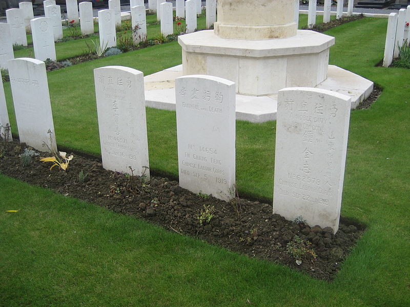The workers mainly aged between 20 and 35 served as labour in the rear echelons or helped build munitions depots. They were tasked with carrying out essential work to support the frontline troops, such as unloading ships, building dugouts, repairing roads and railways, digging trenches and filling sandbags.[] Some worked in armaments factories, others in naval shipyards, for a pittance of one to three francs a day. At the time they were seen just as cheap labour, not even allowed out of camp to fraternise locally, dismissed as mere coolies. When the war ended some were used for mine clearance, or to recover the bodies of soldiers and fill in miles of trenches.] Their contribution went forgotten for decades until military ceremonies resumed in 2002 at the Chinese cemetery of Noyelles-sur-Mer.