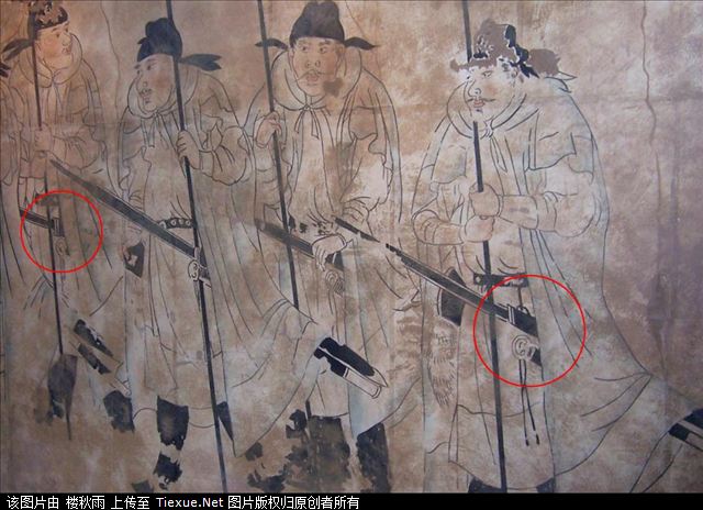 這是一張西漢墓壁畫摹片,我們可以清晰的看到畫中三人所執環首漢刀,請注意左側第二人的雙手握刀姿勢,在仔細看右側兩人手中所執漢刀的刃部,與後來的唐刀幾乎一般無二!