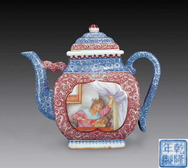 乾隆時期在琺瑯彩瓷上,還出現了一類臨摹西洋人物和景色的紋飾,其用筆光滑平柔,幾乎看不到筆觸,色彩絢麗豐富,並運用焦點透視方式,使畫面上的人物及背景上的建築物,具有光線明暗的立體效果。這些都是制瓷匠師將西洋畫法摻入琺瑯彩瓷繪技藝中的效果。一件黃地小葫蘆瓶,上部橢圓形開光內繪西洋景色,下部海棠花式開光內繪西洋婦女和嬰兒,畫面中人物面部明暗分明,裝束華麗。背景建築物清晰可見。整個圖案從題材到畫法都是西洋風格,是乾隆琺瑯彩瓷受西洋畫風影響的典型之作。