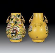 乾隆時期的琺瑯彩嬰戲紋飾,常通過兒童活動,將吉祥之意寓意其中。在一件黃地花卉開光嬰戲紋瓶上,通體以黃釉為地,以各種色料通體彩繪纏枝花卉,三面開光內所繪嬰戲圖,分明寓意“竹報平安”、“吉慶有餘”、“管帶流長”。此瓶在色地上彩繪花卉,明顯具有銅胎畫琺瑯的效果,所繪人物畫法寫實,線條流暢,設色精麗。