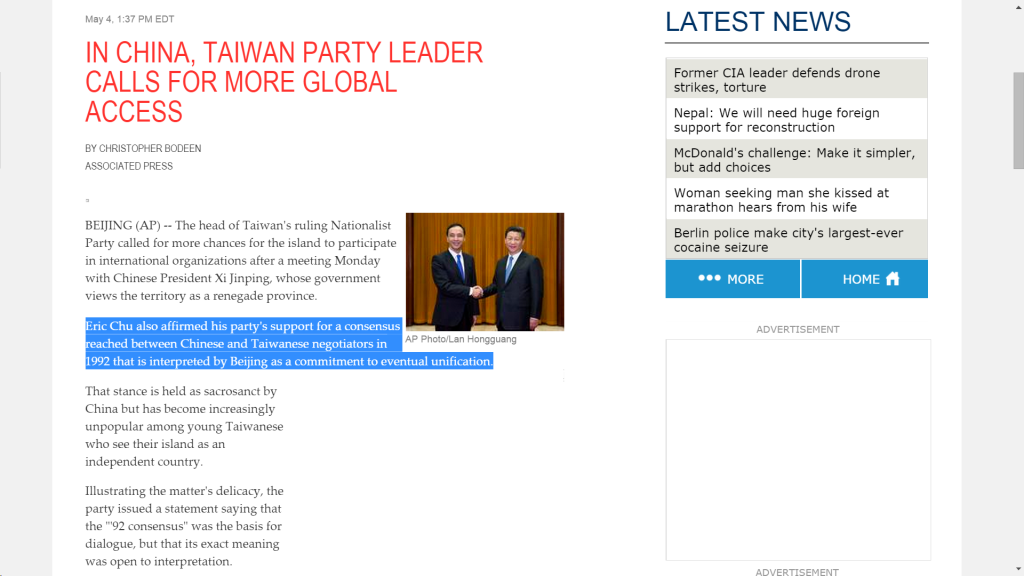 更正後的報導如下:Eric Chu also affirmed his party's support for a consensus reached between Chinese and Taiwanese negotiators in 1992 that is interpreted by Beijing as a commitment to eventual unification.(朱立倫也重申,他的政黨支持中國和台灣的談判者在1992年達成的共識,該共識被北京詮釋為對終極統一的一種承諾)。