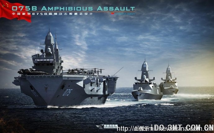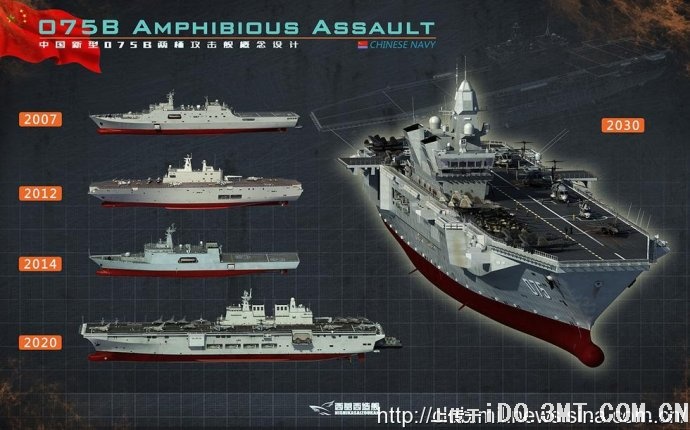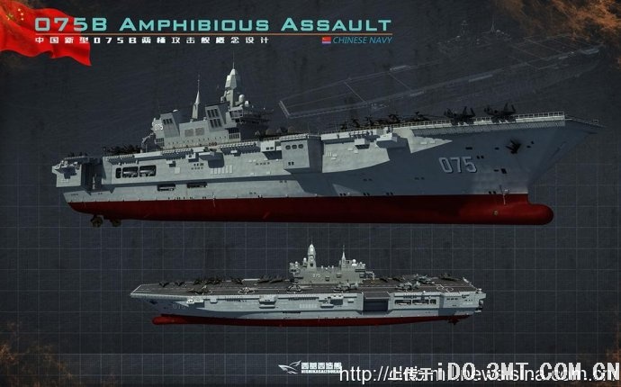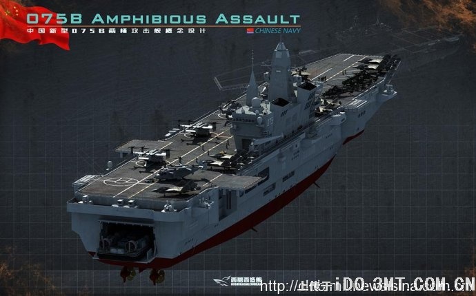 075型大型兩棲攻擊艦”的模型照片,該型兩棲攻擊艦採用直通甲板設計,具有4個直升機起降點,1台升降機,在機庫下還設置有巨大的塢艙,可以搭載一定數量的國產氣墊船。在整體外形上,“075型”的兩棲攻擊艦與中國在在2012年阿布扎比防務展上展示的2.5萬噸級出口兩棲攻擊艦非常相像,因此有分析認為出口型號有可能是解放軍自用的075型兩棲攻擊艦的衍生產品。