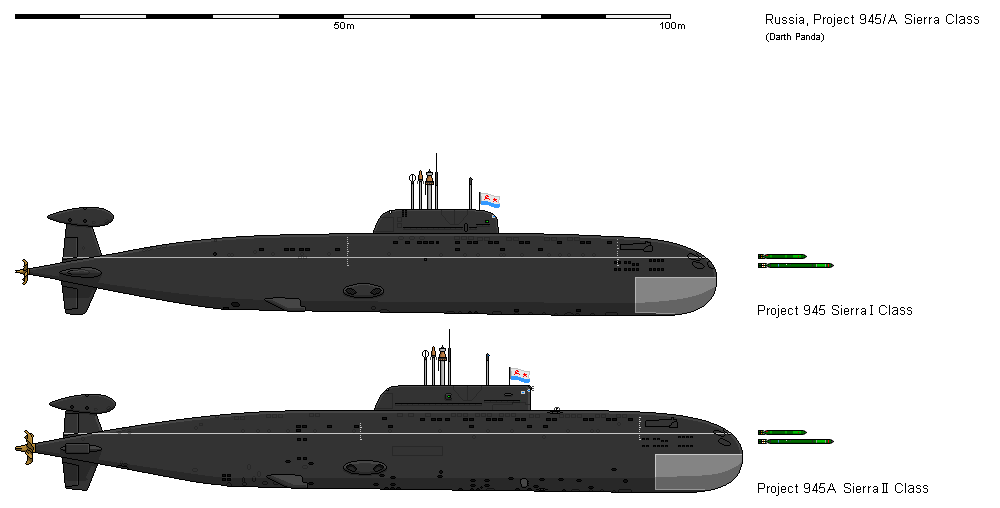 Russia's small and expensive Project 945 Barracuda class (NATO designation Sierra I class) was the successor to the ill-fated Alfa class, built form the mid-1960s to 1981 and all are now phased out from active service. Its two light and strong titanium hulls enabled it to operate at great depths and provided reduced radiated noise levels as well as increased resistance to damage of torpedo attacks. Soviet titanium technology was far in advance of the West, requiring fewer passes to achieve a successful weld, but the cost of the hulls limited the numbers built, despite advantages in depth and underwater speed. The first Sierra I class boat, Tula (ex-Karp) was laid down in 1982 at Gorky Shipyard, launched in August 1983, and was fitted out in Severodvinsk. It was laid up in 1997 due to funding problems. The survivor, Kostroma (ex-Krab) was launched in 1986, and commissioned in 1987. This boat is active as of 2012. In 2012 a contract was signed to refit and upgrade both of these boats. Refit of the Tula commenced in 2017. It is expected to return to active service in 2017. |