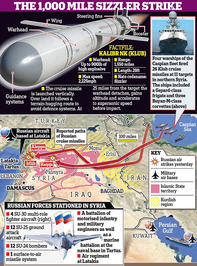 俄羅斯此次使用巡航導彈打擊敘利亞目標,帶有兩個目的,一是發出強烈威懾,在裡海以及從地中海的潛艦發射導彈,使俄羅斯成為世界上第二個進行艦載巡航導彈實戰的國家,這給周邊海域國家以巨大威懾,