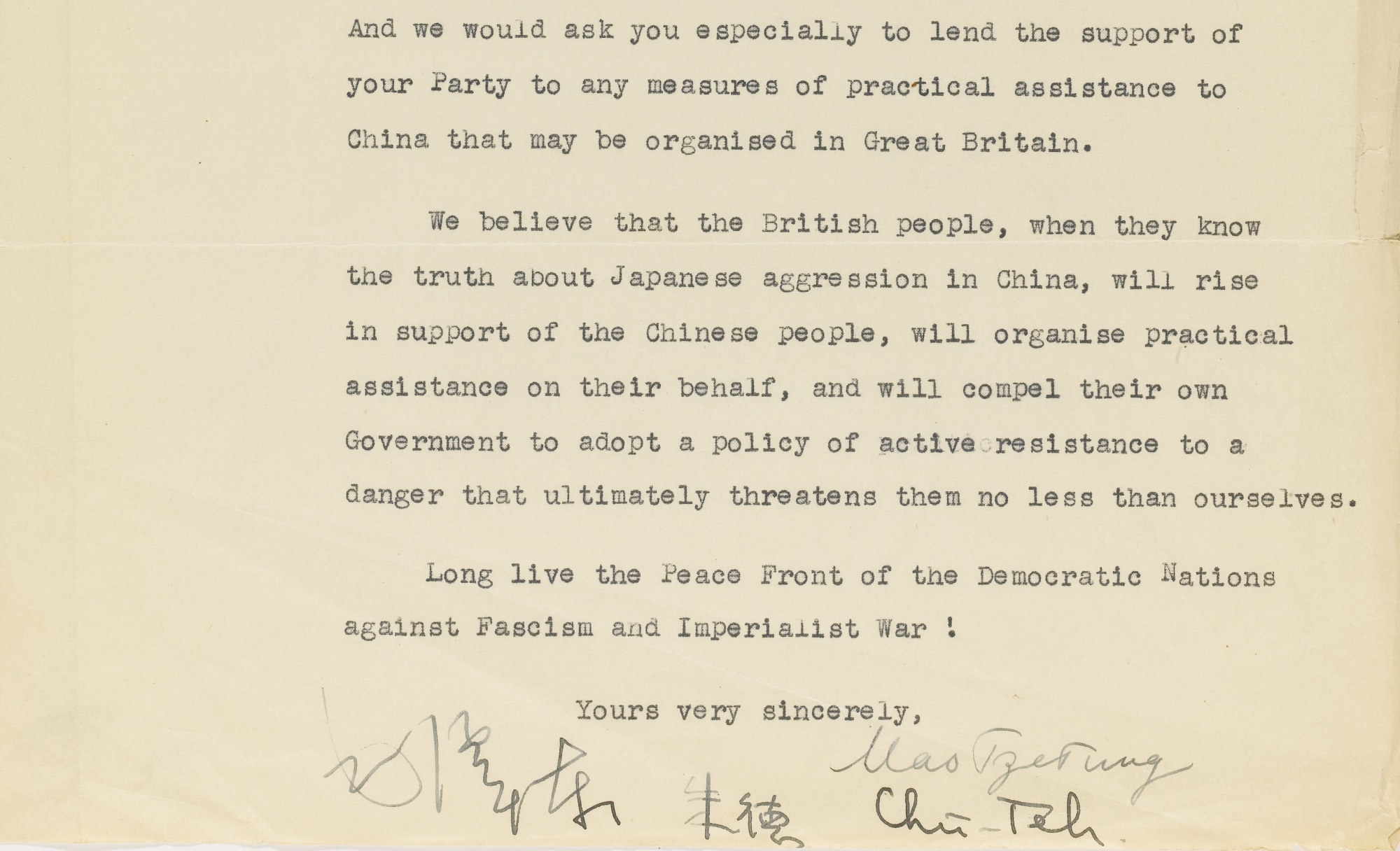 "We believe that the British people, when they know the truth about Japanese aggression in China, will rise in support of the Chinese people, will organize practical assistance on their behalf, and will compel their own government to adopt a policy of active resistance to a danger that ultimately threatens them no less than ourselves,"the letter said.
