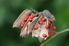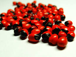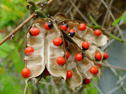 Abrus precatorius, known commonly as jequirity Crab's eye,] rosary pea, precatory pea or bean,[ John Crow Bead,[] Indian licorice,] Akar Saga, gidee gidee[] or Jumbie bead[] in Trinidad and Tobago, is a slender, perennial climber that twines around trees, shrubs, and hedges. It is a legume with long, pinnate-leafleted leaves.