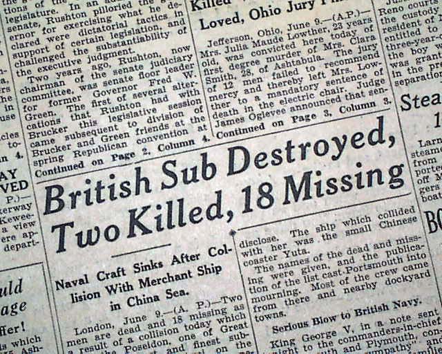 英國海軍的「海神」號潛艇在1929年下水服役,兩年後在中國山東海岸附近同一艘貨輪相撞後沉沒。